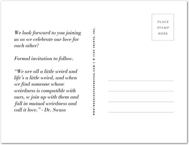 Since save-the-dates are a relatively new wedding tradition, there is no formal way of choosing how they will look. Some choose to create a postcard while others go with a magnet or video. Plain Jane Designs says that as long as you have included these five important pieces of information listed above, feel free to make the save-the-date look however you want! Most Couples seem to incorporate the color scheme or them of their wedding into their look of the save-the-date, however the decision is entirely up to you. Whichever way you choose to do your save-the-date, tailor it to your personality. It is your special day; do what makes you happy!